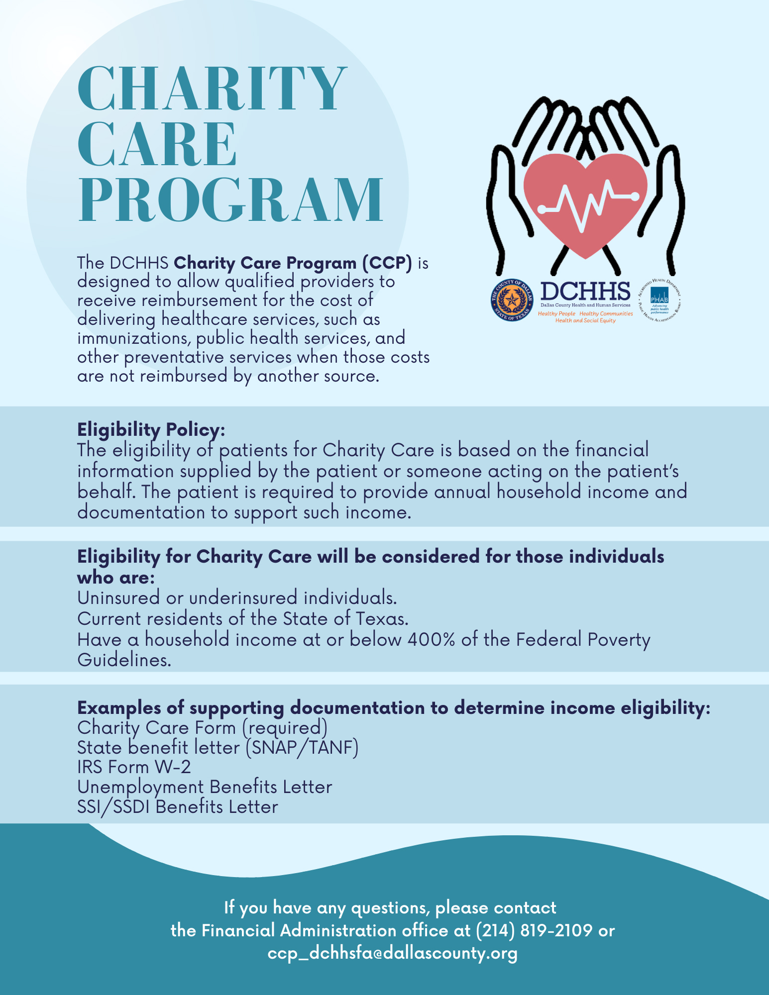 The DCHHS Charity Care Program (CCP) is designed to allow qualified providers to receive reimbursement for the cost of delivering healthcare services, such as, immunizations, public health services, and other preventative services, when those costs are not reimbursed by another source.