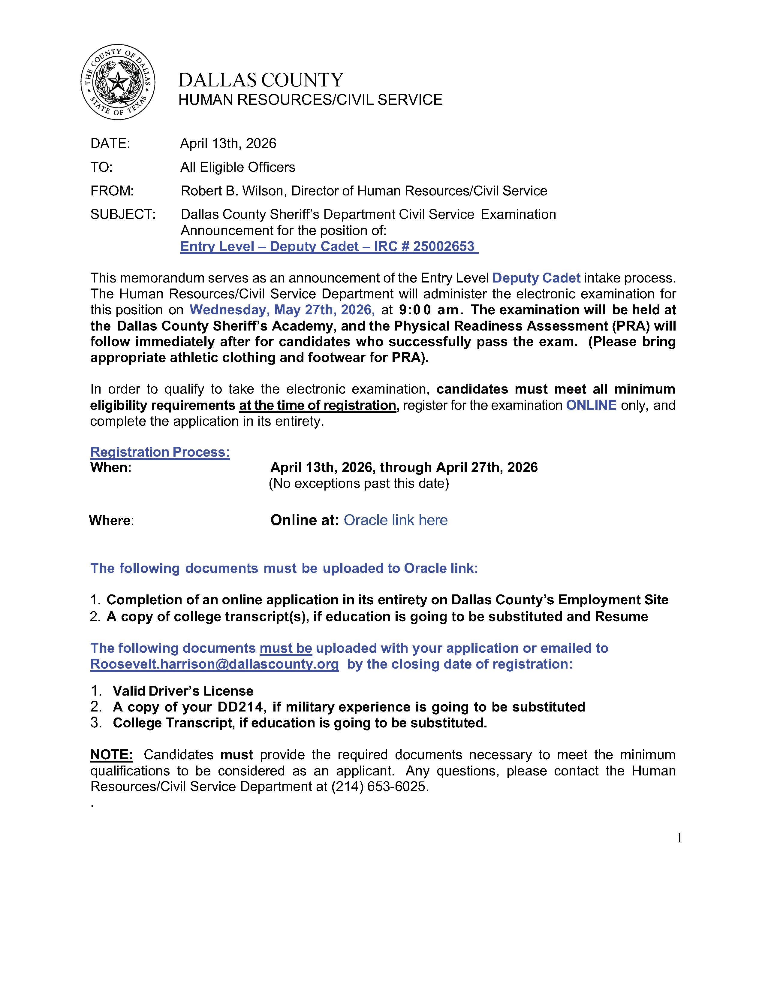 This announcement serves as notification of registration for the Entry Level - Deputy Cadet which will be administered on May 27, 2026. In order to qualify and take the written examination, candidates must: