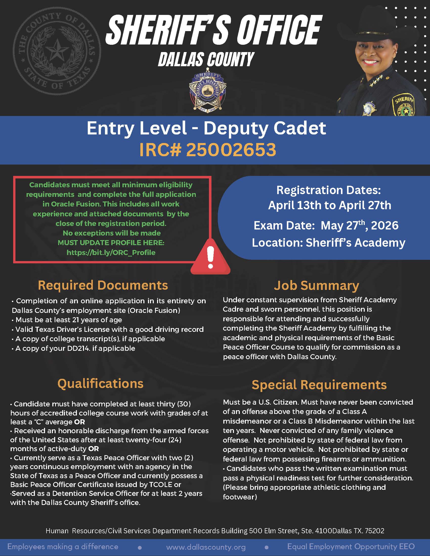 | Step 3. | Upload a copy of your DD214 (if applicable) and proper identification when you register online or forward to ER-SheriffRecruiting@dallascounty.org Examples of I.D. (Driver’s License, Dallas County ID badge) |
