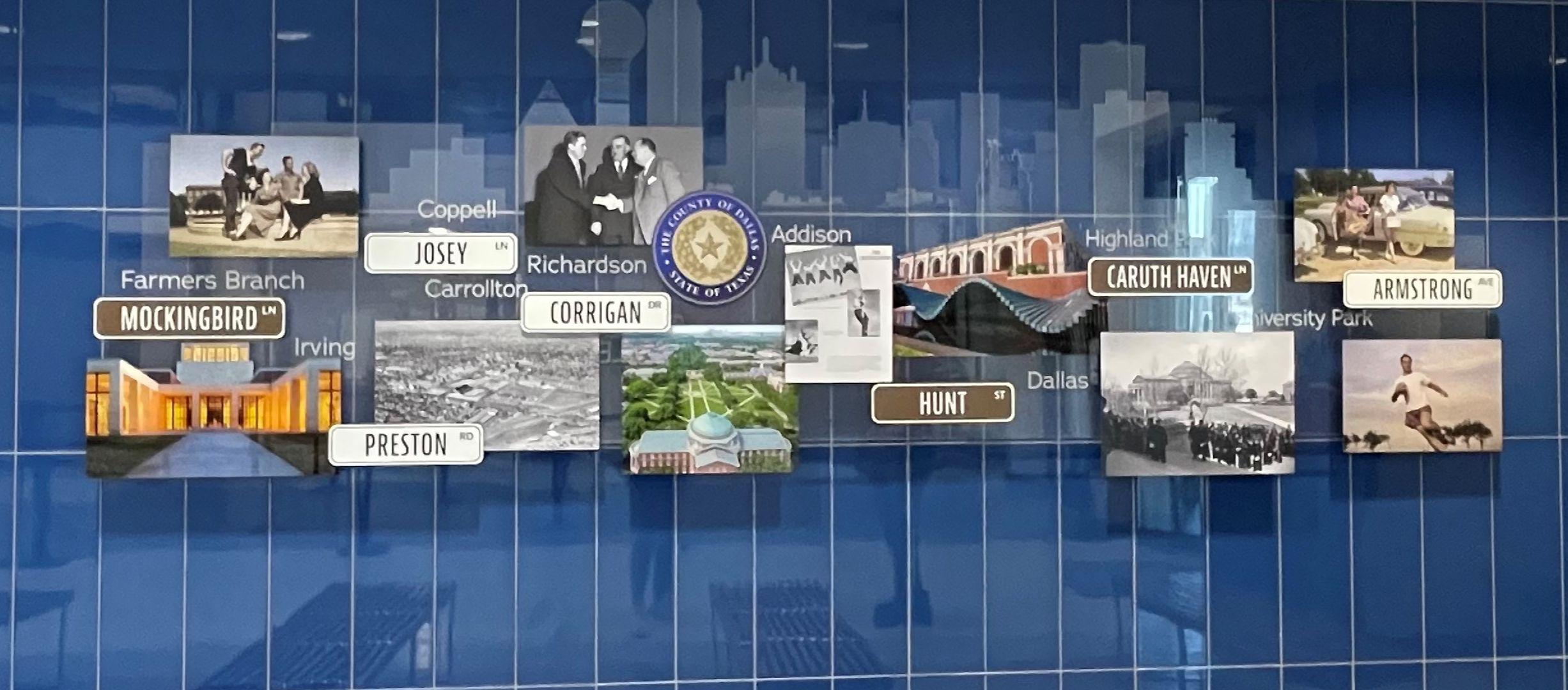 Our long-awaited artwork inside the North Dallas Government Center was finally installed a few weeks ago! Among the displays are portraits of William Walter Caruth and his wife Mabel – one of the oldest philanthropic families in Dallas, who owned a large portion of land that is now located in District 2; a spotlight on Southern Methodist University (SMU); and a collage of pictures that highlight some of the historical locations throughout the district.